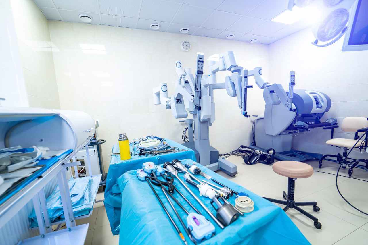 The da Vinci robotic device consists of four main parts: the operating table, robotic arms, an imaging system, and a control console. Each stage of the surgical procedure is controlled by a specially trained surgeon, who is sitting at the control console of the da Vinci robot, sees the surgical field on the monitor in multiple zooms in 3D mode, and gives the robotic system commands, which it carries out with pinpoint accuracy. The use of robotic surgery ensures high precision and low trauma rates, resulting in reduced risks of blood loss, mild pain in the postoperative period, almost zero infection risks, and a significantly shorter hospital stay after surgery.