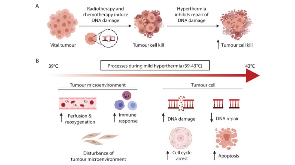 Hyperthermia therapy involves heating tumor tissues to temperatures of about 40-43 °C. This "fever-like" state makes cancer cells more vulnerable to chemotherapy and radiation, while healthy tissues are less affected. For example, clinical trials have shown that adding hyperthermia to radiotherapy doubles complete response rates (56% vs. 31%) in recurrent cervical cancer [8, 9].