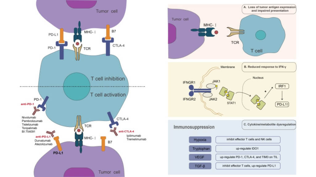 One of the most important breakthroughs in cancer immunotherapy has been the development of immune checkpoint inhibitors. Normally, the immune system uses checkpoints such as PD-1, PD-L1, and CTLA-4 to prevent T-cells from overreacting and damaging healthy cells. Colon tumor cells, however, exploit these checkpoints by sending "false signals" that deactivate the body’s defenses. Drugs known as checkpoint inhibitors block these signals, allowing T-cells and other cells of the immune system to stay active and continue to attack cancer cells.
