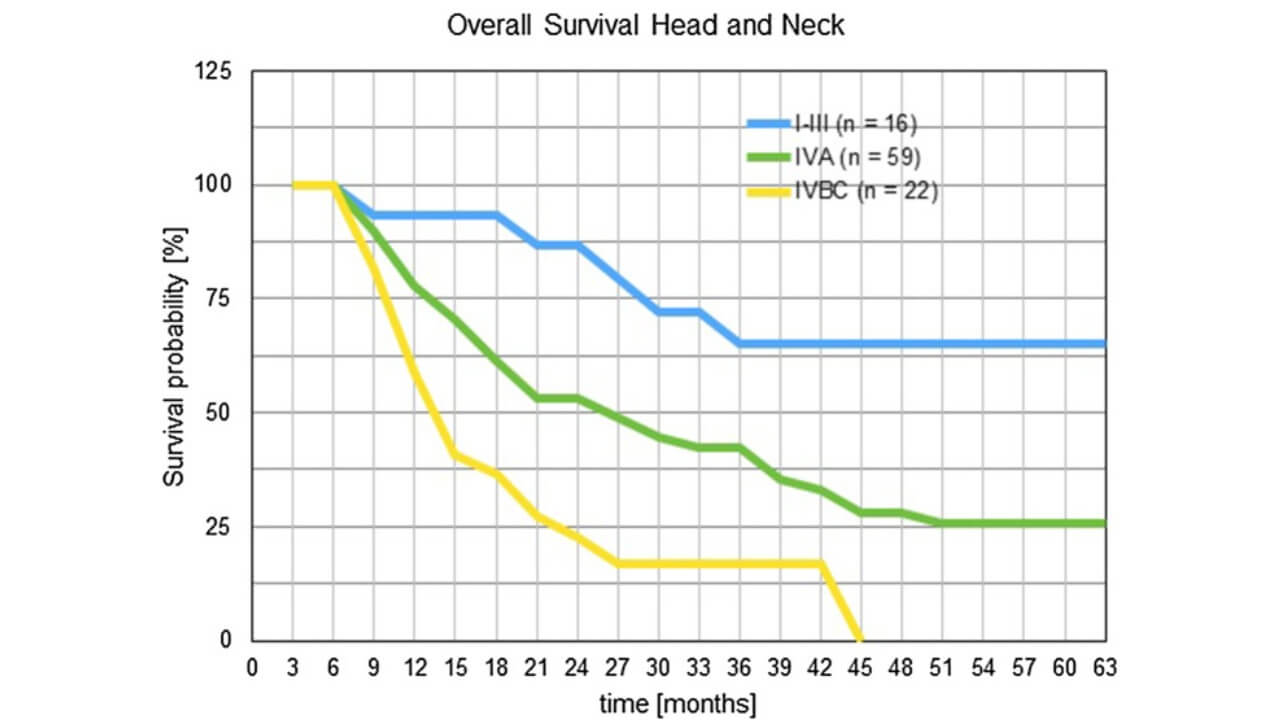 Studies were performed in which patients with head and neck cancer received short-term intra-arterial infusion chemotherapy. The one-year survival rates were 59%, 82% and 93%, respectively, for stages IVB/C, IVA and I–III. The two-year survival rates for these same stages were 22%, 53% and 86%. Three-year survival rate – 17%, 42% and 65%, respectively [9].