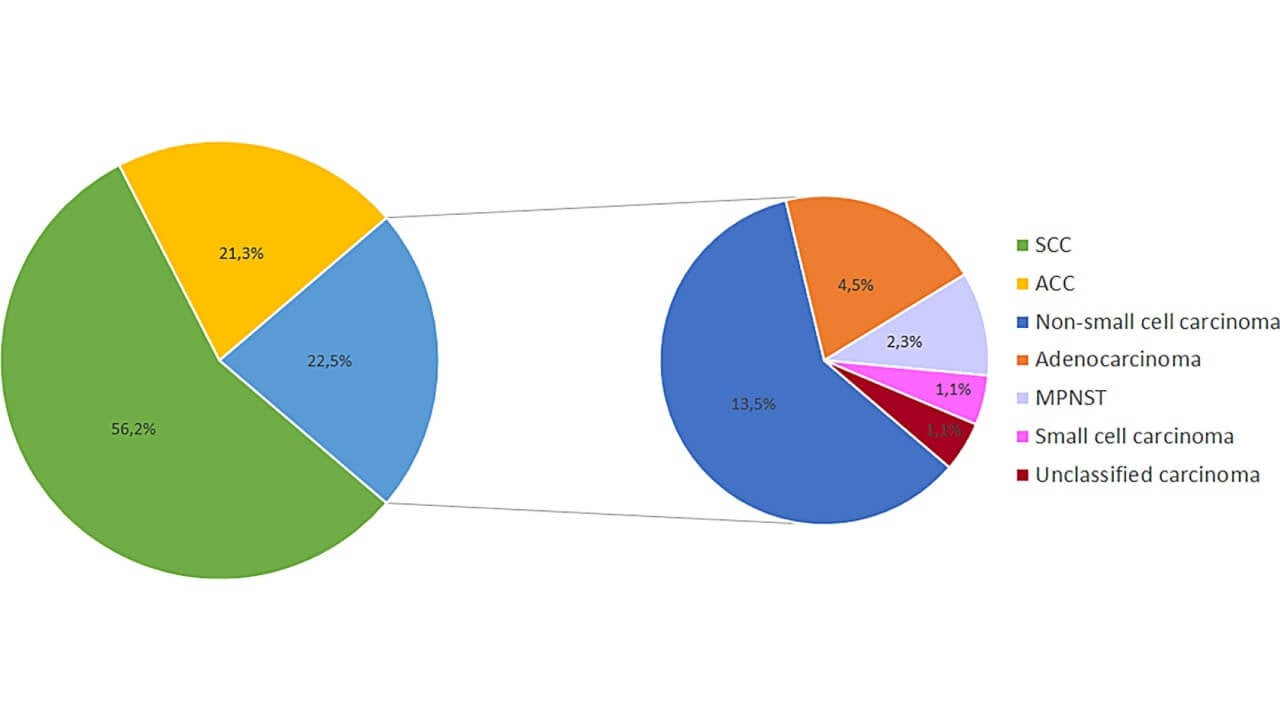 Central airway tumors can be considered part of the spectrum of diseases related to head and neck cancer due to the anatomical and clinical proximity to the airways. Primary tracheal tumors (a type of airway cancer) are rare, but in adults they are usually cancerous, accounting for about 0.2% of all malignant tumors [1]. The estimated incidence of tracheal cancer is about 0.1 per 100,000 population per year. Primary tracheal tumors in adults are almost always malignant (up to 90%), whereas in children they are malignant in only about 10-30% of cases. Tracheal tumor growth near the trachea can put pressure on the larynx voice box, causing hoarseness or loss of voice. Squamous cell carcinoma of the trachea is the most common malignant histological type of tracheal tumor in adults. Adenoid cystic carcinoma of the trachea is usually characterized by slow growth, but has a tendency to local infiltrative spread [2].